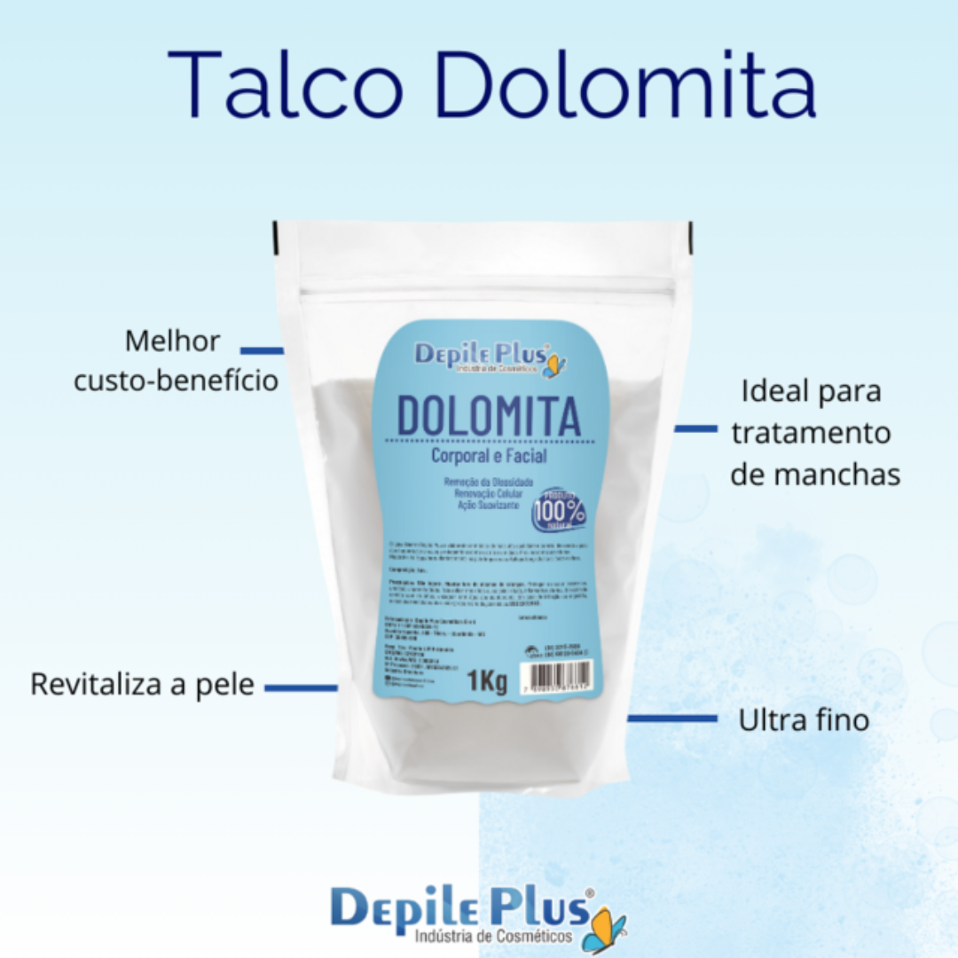Descubra os múltiplos benefícios da Dolomita Depile Plus, um pó ultrafino 100% natural, ideal para cuidar da sua pele do rosto e corpo. Com sua composição rica em cálcio e magnésio, a dolomita é um verdadeiro elixir para a beleza e saúde da sua pele, oferecendo propriedades que acalmam, clareiam e revitalizam.